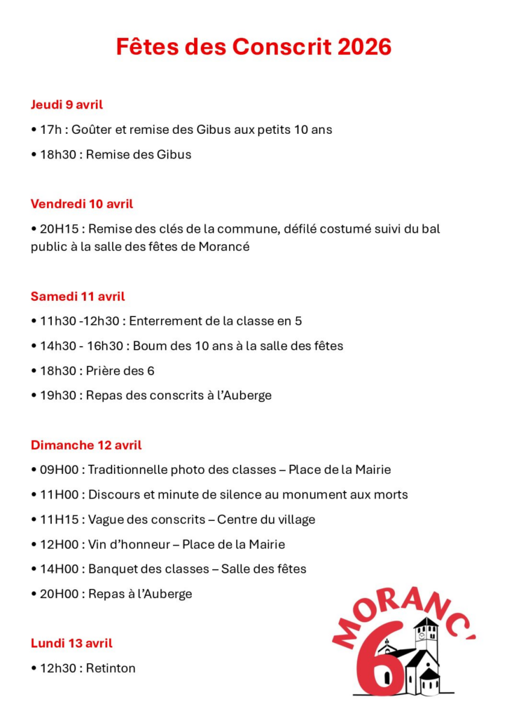 La fête des Conscrits organisée par la Classe en 6 aura lieu du vendredi 10 au dimanche 12 avril.